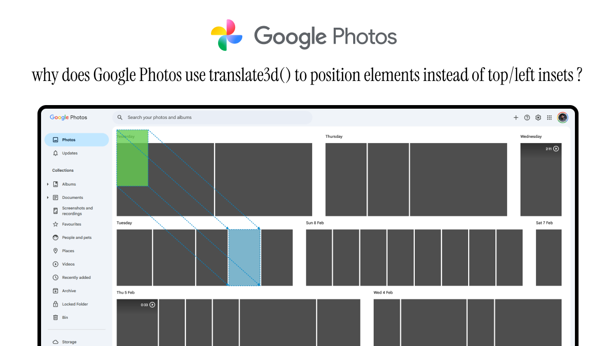 I have been learning frontend system design by reverse engineering real products, and Google Photos was my first deep dive. One thing that stood out immediately was how they position thousands of thumbnail images in their grid. Instead of using top and left and other inset properties, they rely heavily on transform: translate3d(x, y, 0).